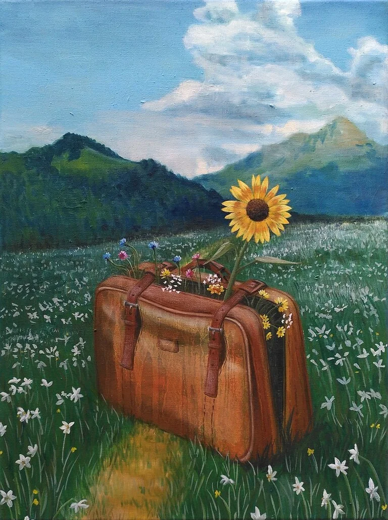 For the painting “Bloom here and now” I started with an abstract background created with liquid paint that I let drip down. I then built up the picture, layer by layer, starting with the landscape in the background and then the suitcase. Finally I added the flowers and the last details for the suitcase.